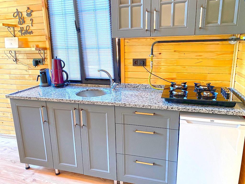 يشتمل المطبخ على موقد وثلاجة صغيرة وآلة صنع الشاي وآلة صنع القهوة وأدوات المطبخ.