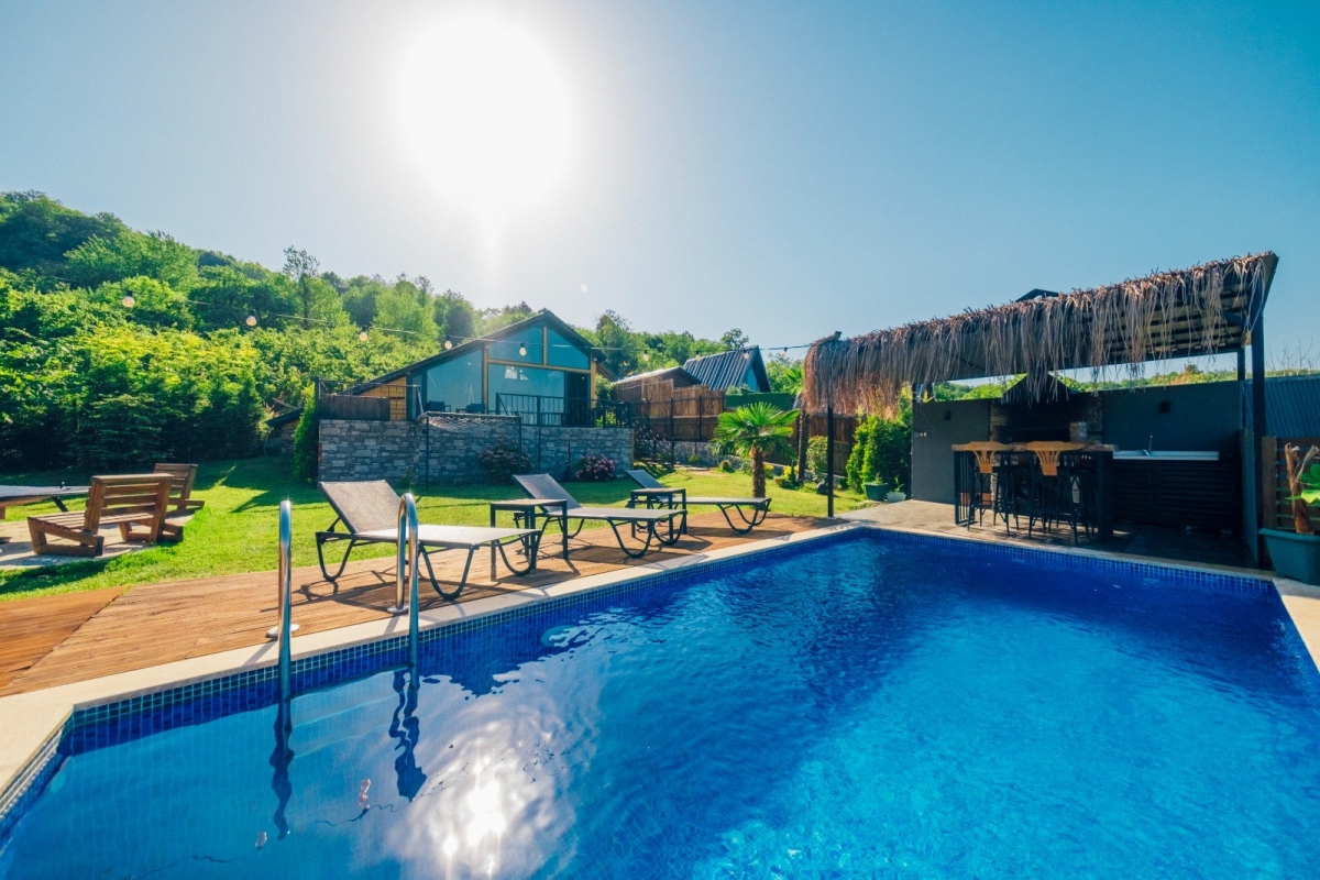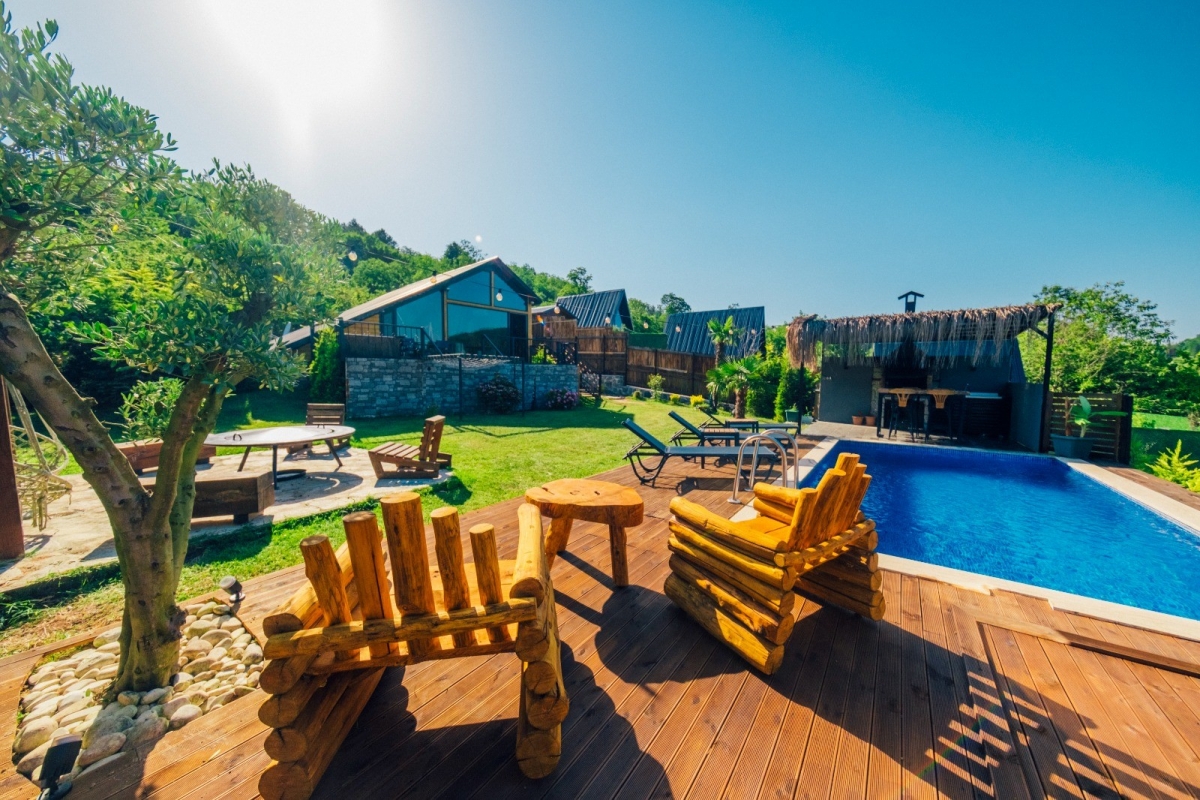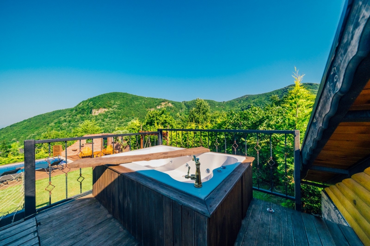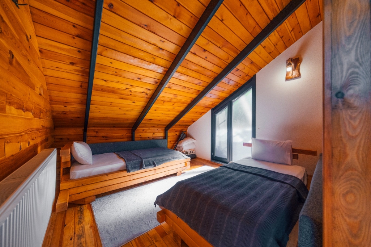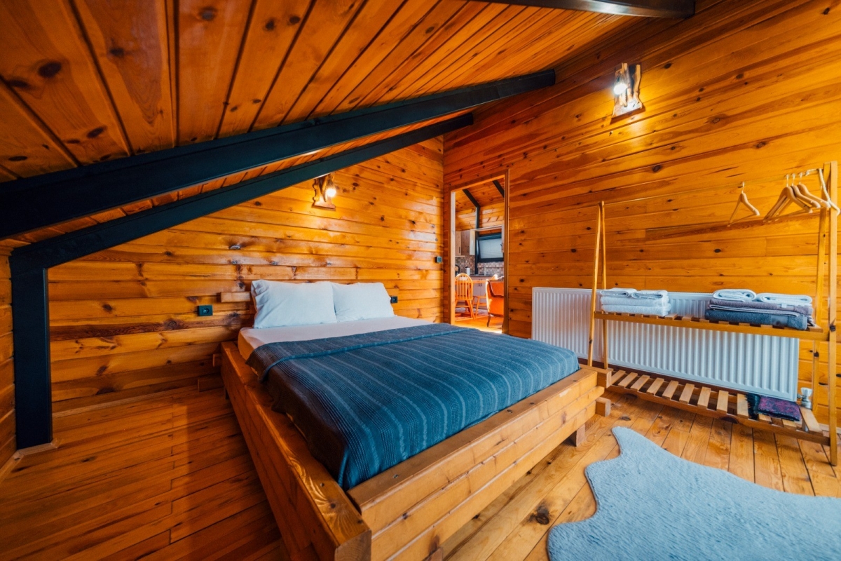 يحتوي الكوخ على حديقة خاصة بمساحة 500 متر مربع، وتتكون من غرفتي نوم وغرفة معيشة. يوجد سرير مزدوج وسريران مفردان. غرفة المعيشة والمطبخ منفصلان، وهو مجهز بالكامل بالأجهزة. مسبح مُدفأ (شتويًا)، جاكوزي، موقد نار، وشواية.