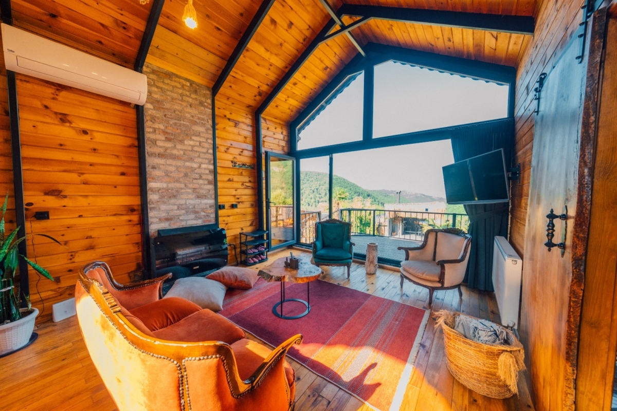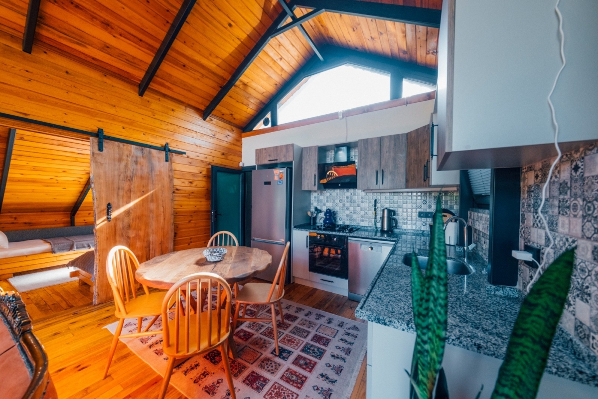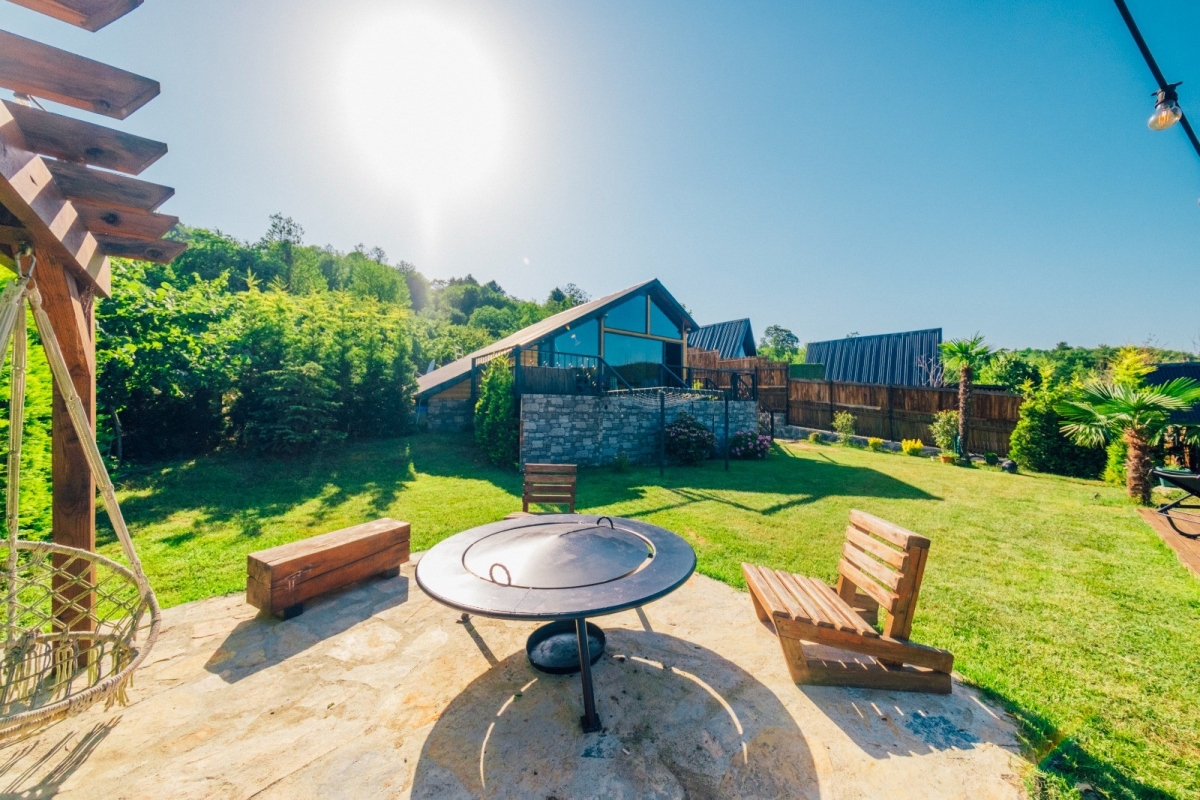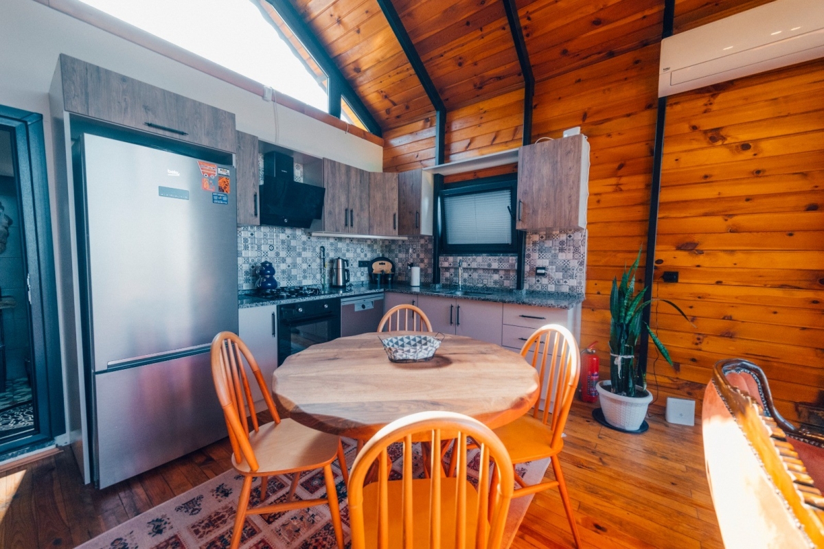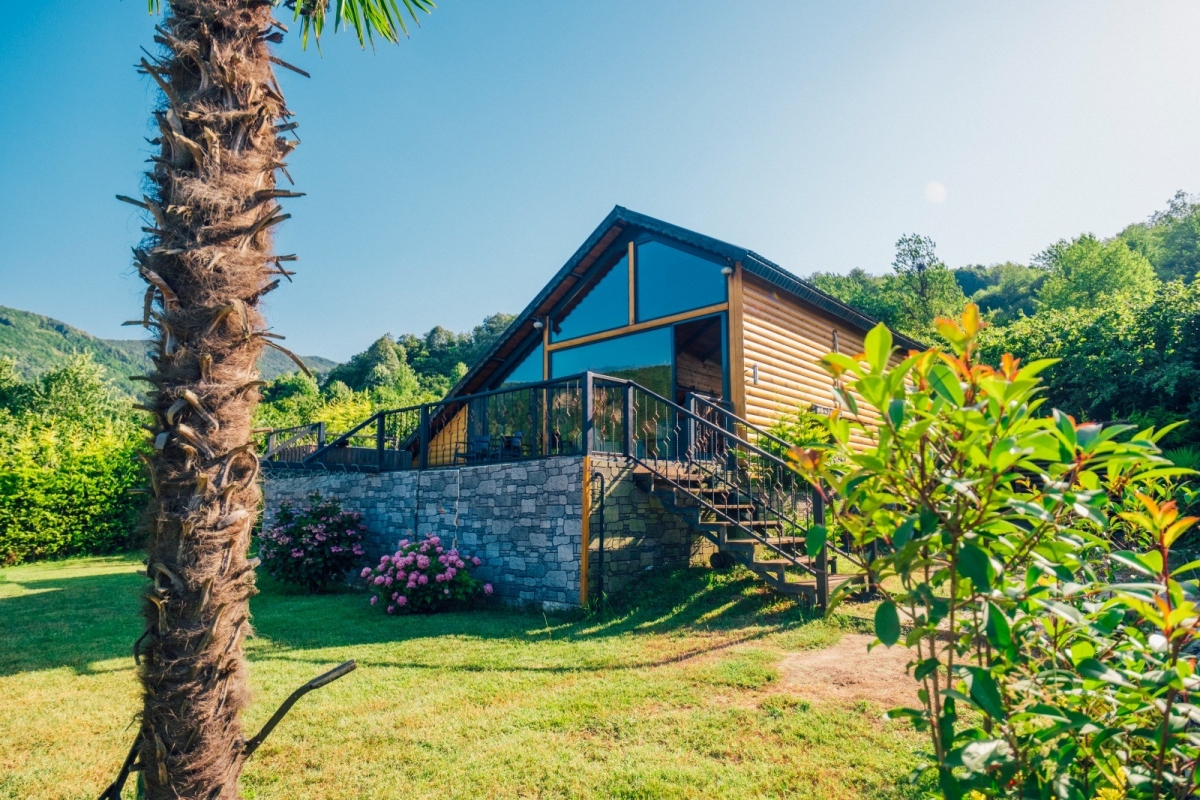 يحتوي الكوخ على حديقة خاصة بمساحة 500 متر مربع، وتتكون من غرفتي نوم وغرفة معيشة. يوجد سرير مزدوج وسريران مفردان. غرفة المعيشة والمطبخ منفصلان، وهو مجهز بالكامل بالأجهزة. مسبح مُدفأ (شتويًا)، جاكوزي، موقد نار، وشواية.