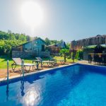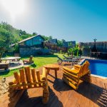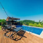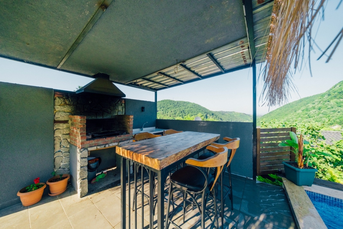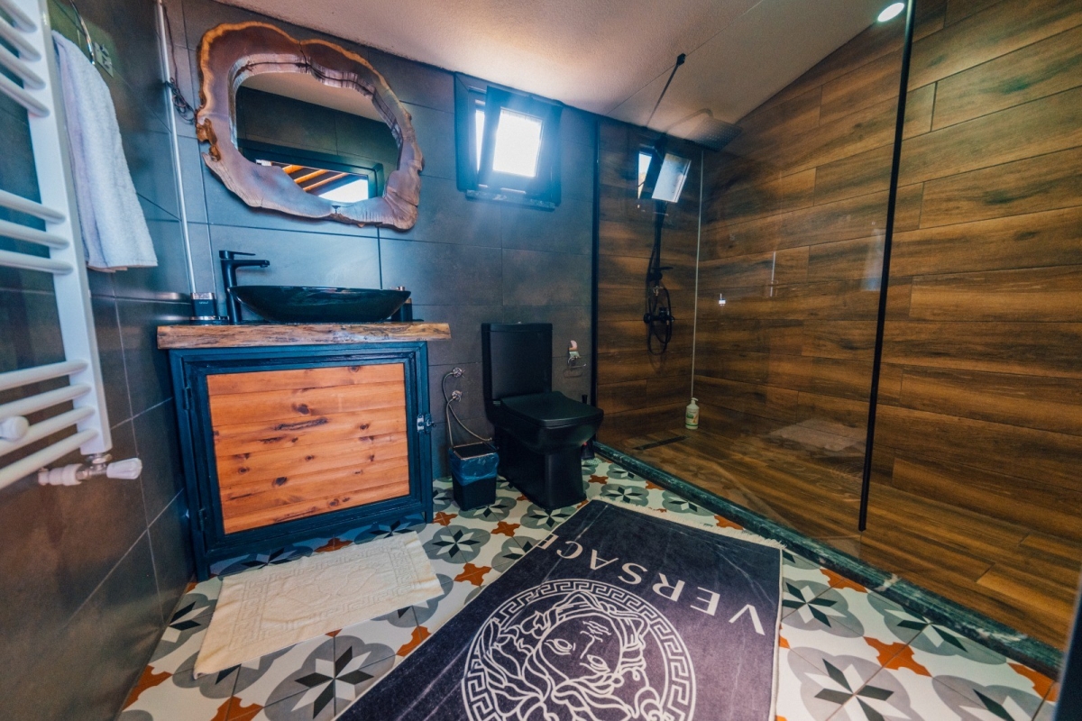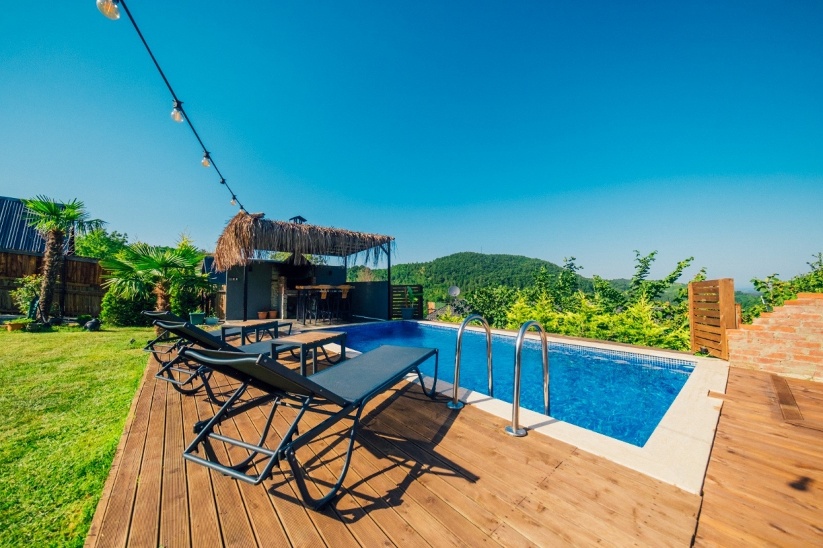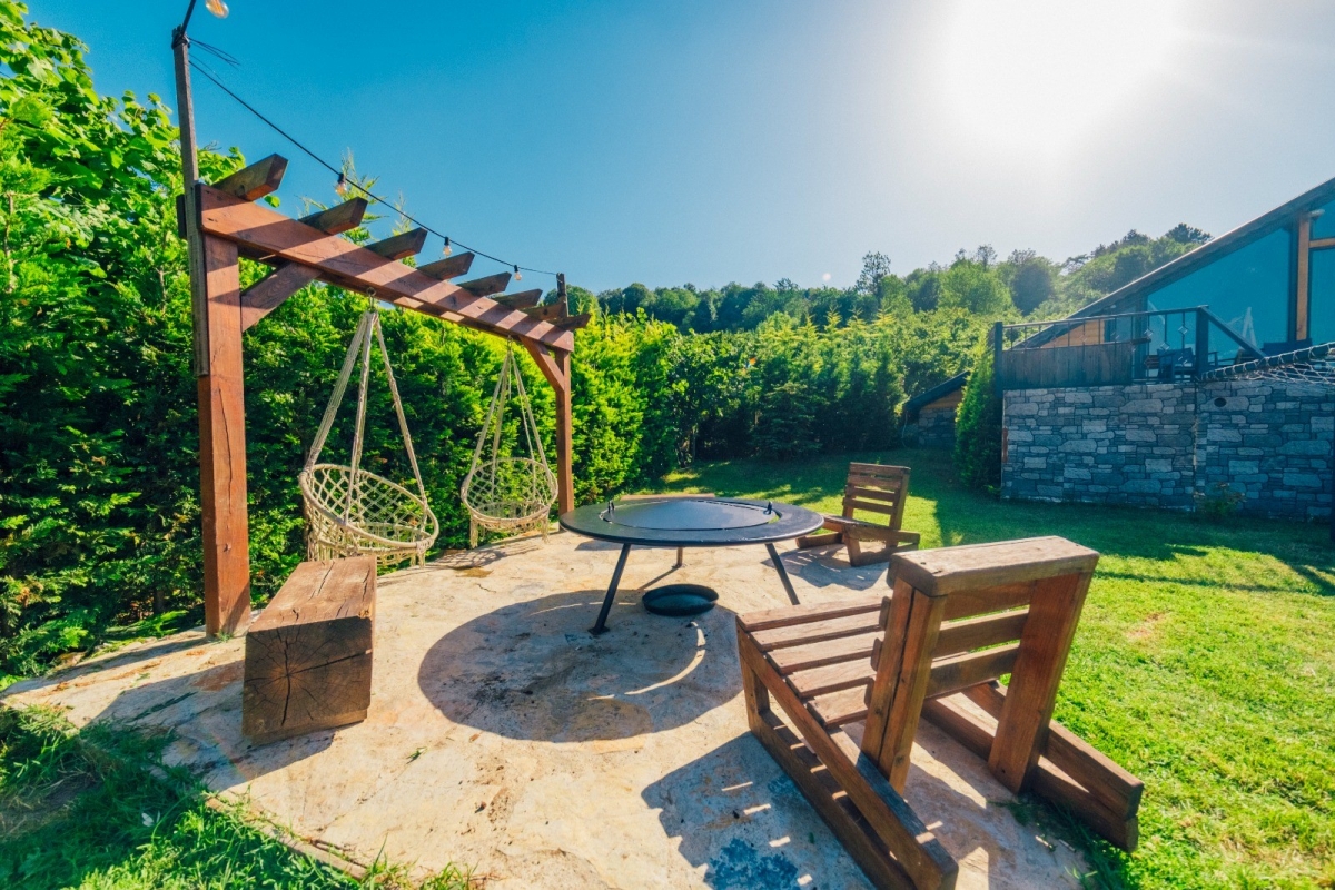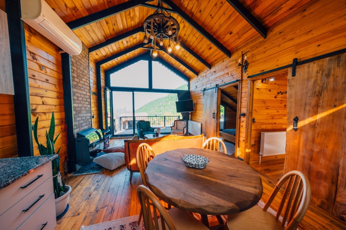يحتوي الكوخ على حديقة خاصة بمساحة 500 متر مربع، وتتكون من غرفتي نوم وغرفة معيشة. يوجد سرير مزدوج وسريران مفردان. غرفة المعيشة والمطبخ منفصلان، وهو مجهز بالكامل بالأجهزة. مسبح مُدفأ (شتويًا)، جاكوزي، موقد نار، وشواية.