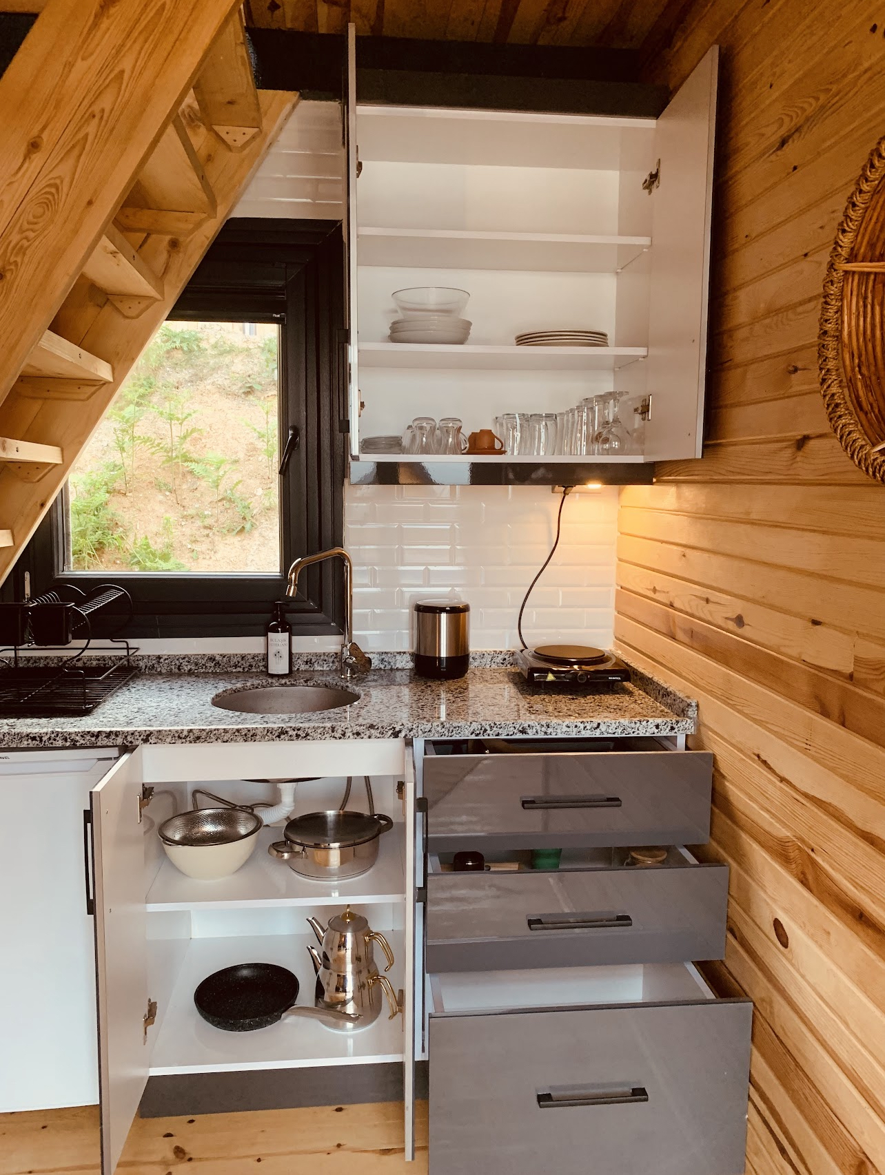 موقد كهربائي وثلاجة صغيرة وأدوات المطبخ.