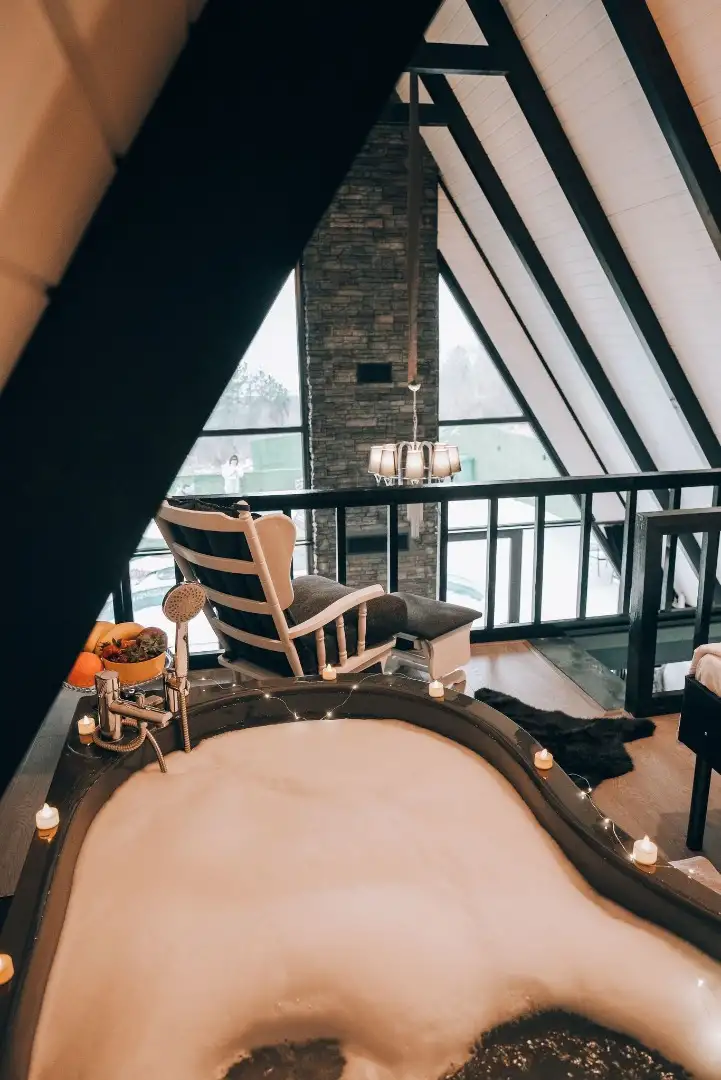 غرفة المعيشة: يوجد كرسي بذراعين على شكل حرف L غير قابل للتمديد، ومدفأة كلاسيك على الوجهين، وطاولة طعام، وتلفزيون، ومكيف، وواي فاي، ومرحاض وحمام.