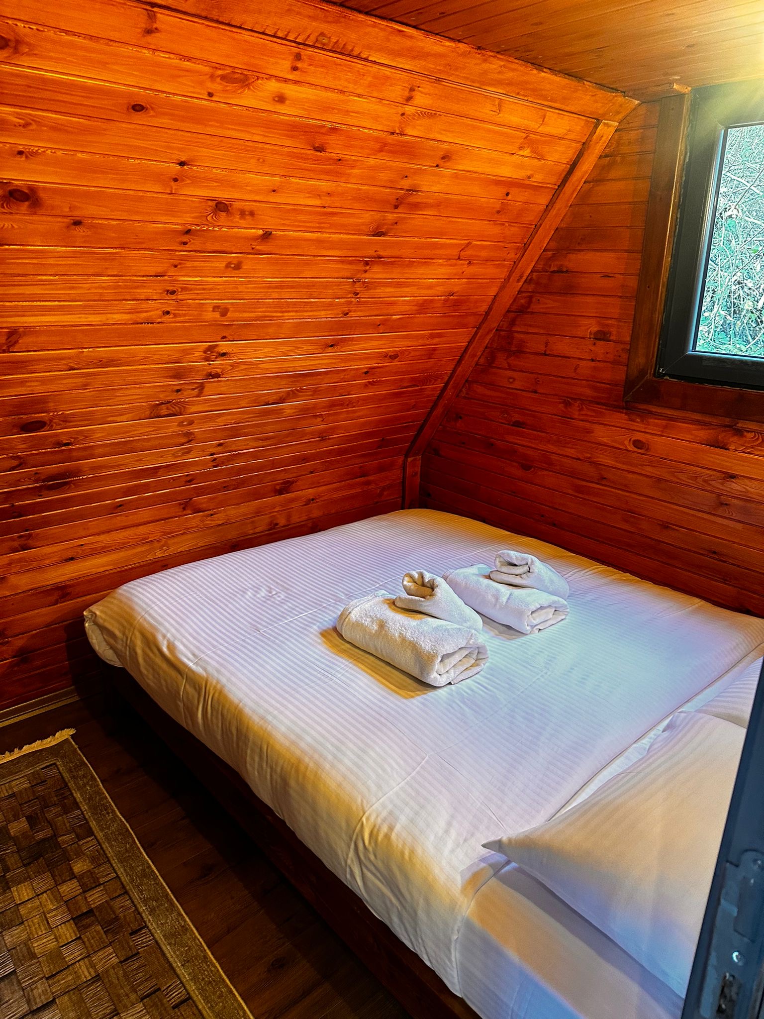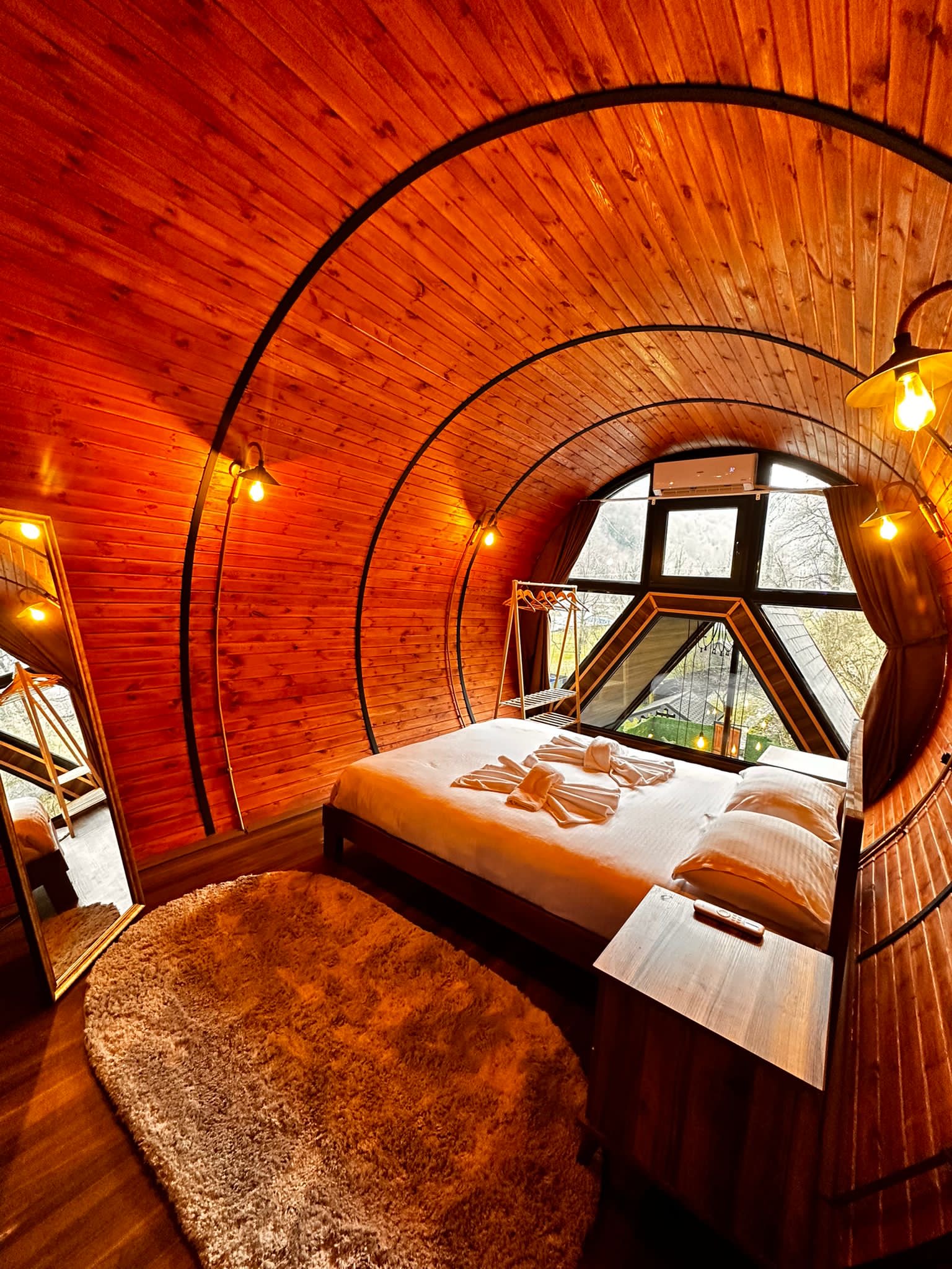 يوجد سريرين زوجية ومجموعة جلوس قابلة للتمديد.