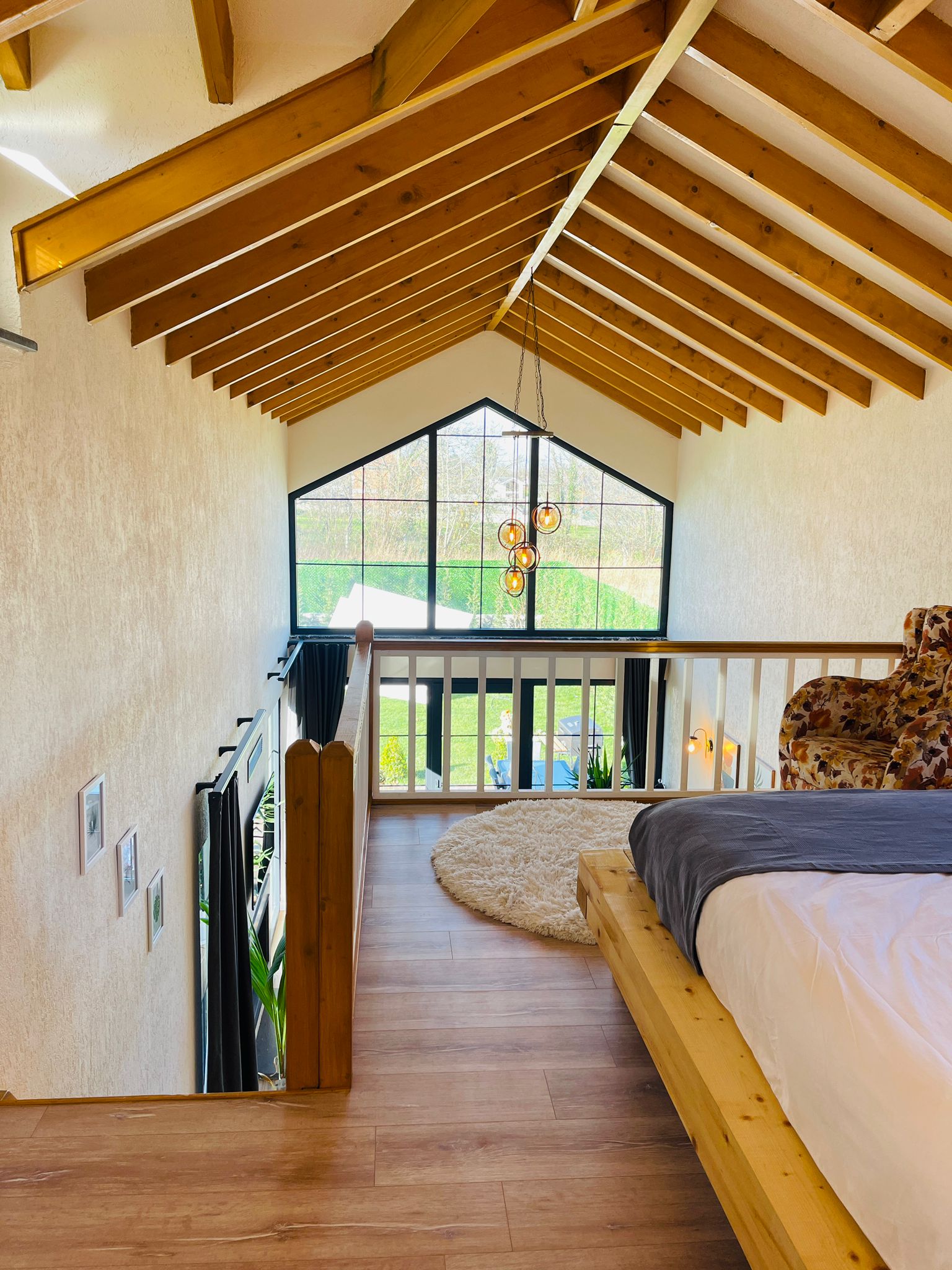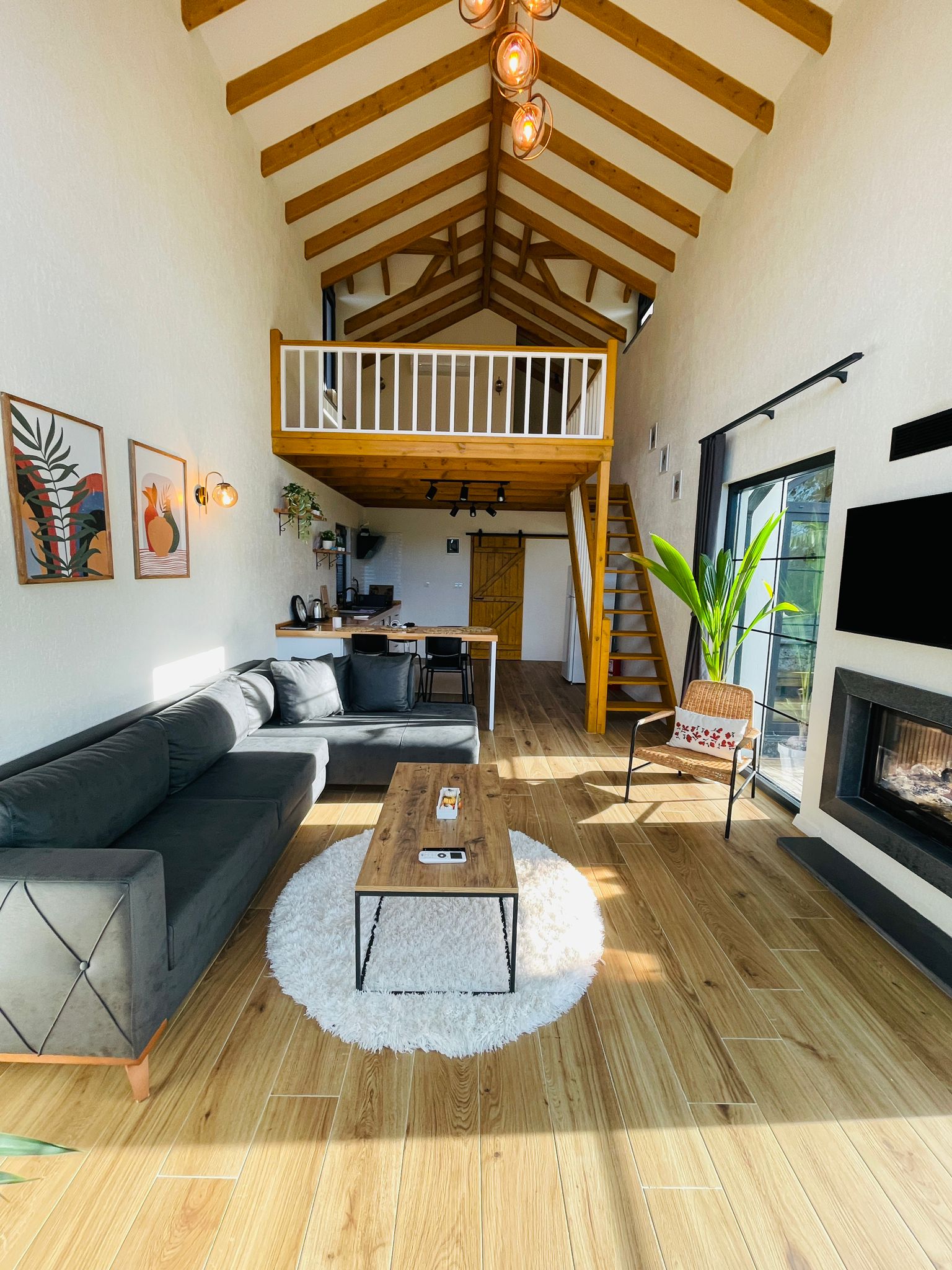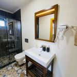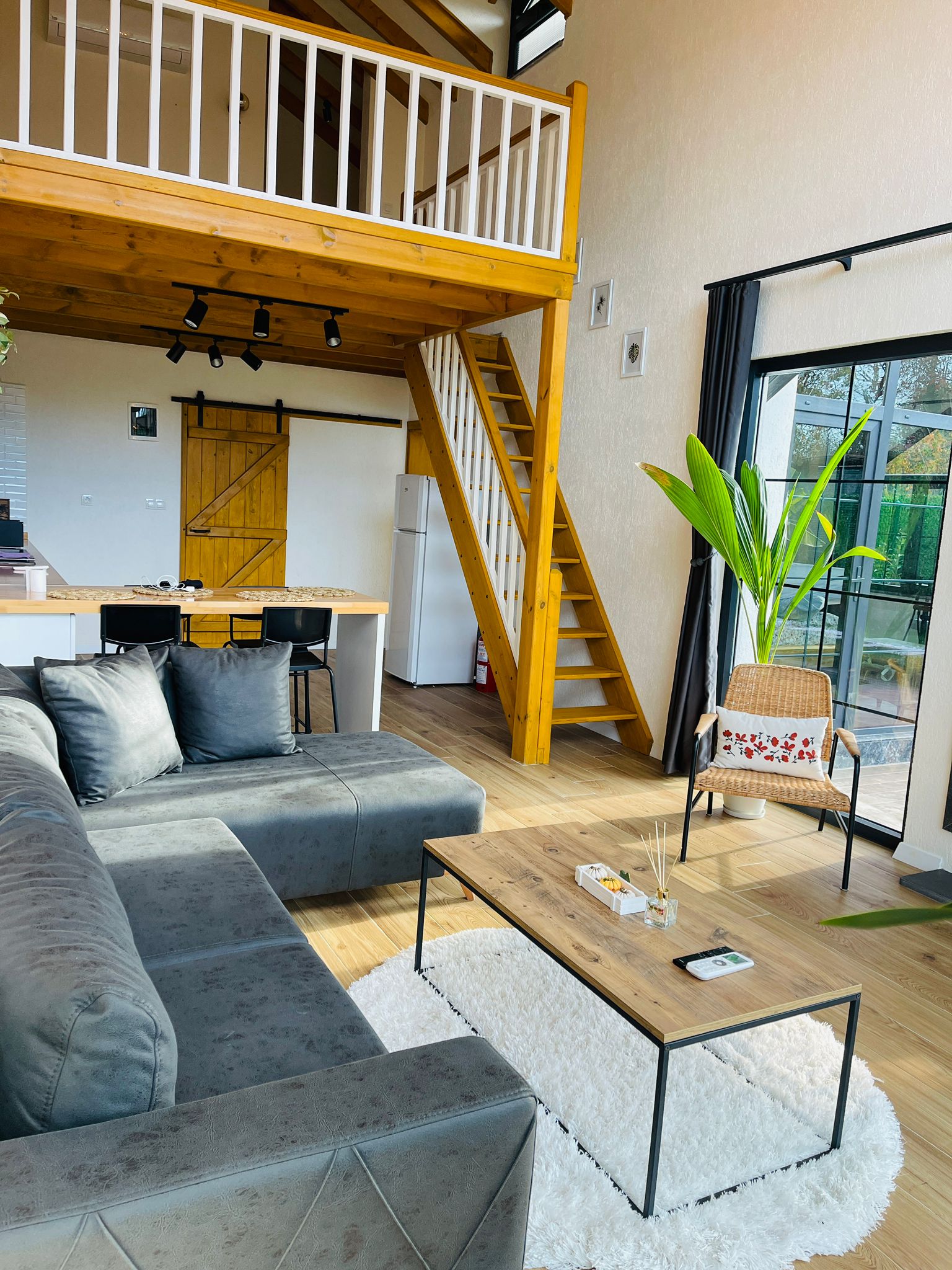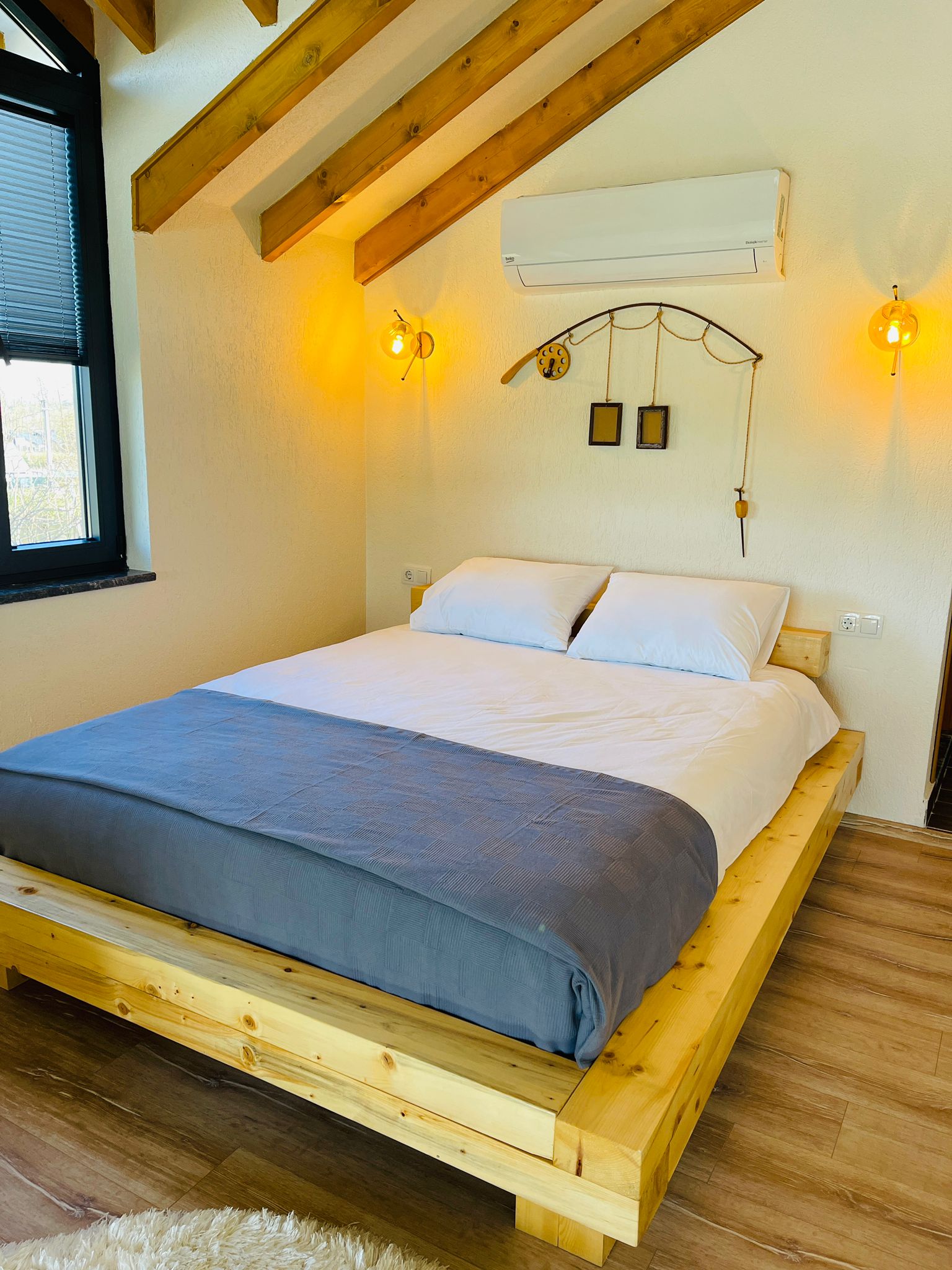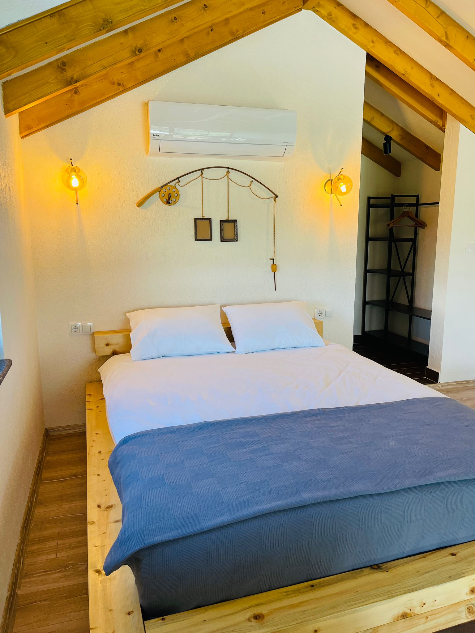 غرفة النوم الأولى: (طابق الميزانين) سرير زوجي وحمام خاص وتكييف